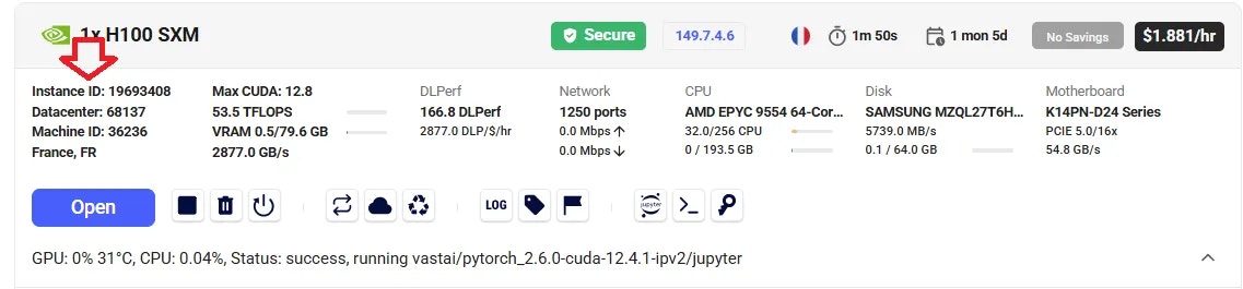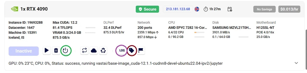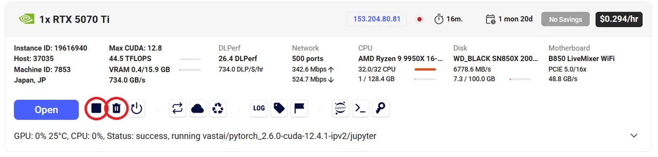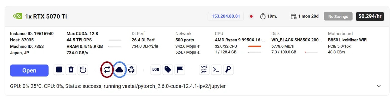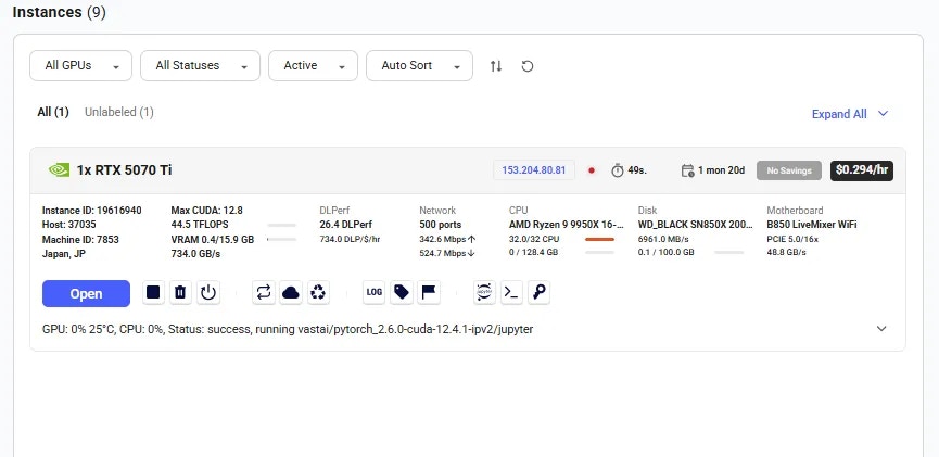The Instances page (cloud.vast.ai/instances) is your central hub for managing rented instances. From here you can: