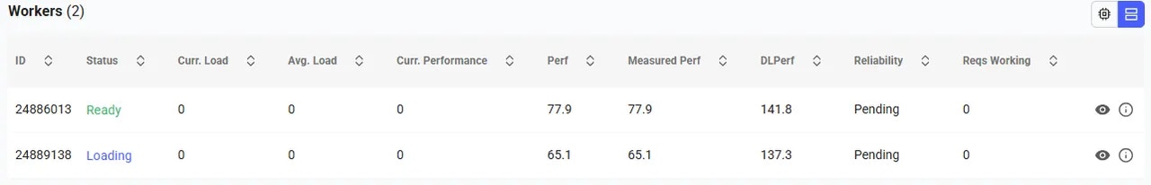 Now that we have created both the Endpoint and the Workergroup, all that is left to do is await for the first “Ready” worker. We can see the status of the workers in the Serverless section of the Vast.ai console. The workers will automatically download the Qwen3-8B model defined in the template, but it will take time to fully initialize. The worker is loaded and benchmarked when the