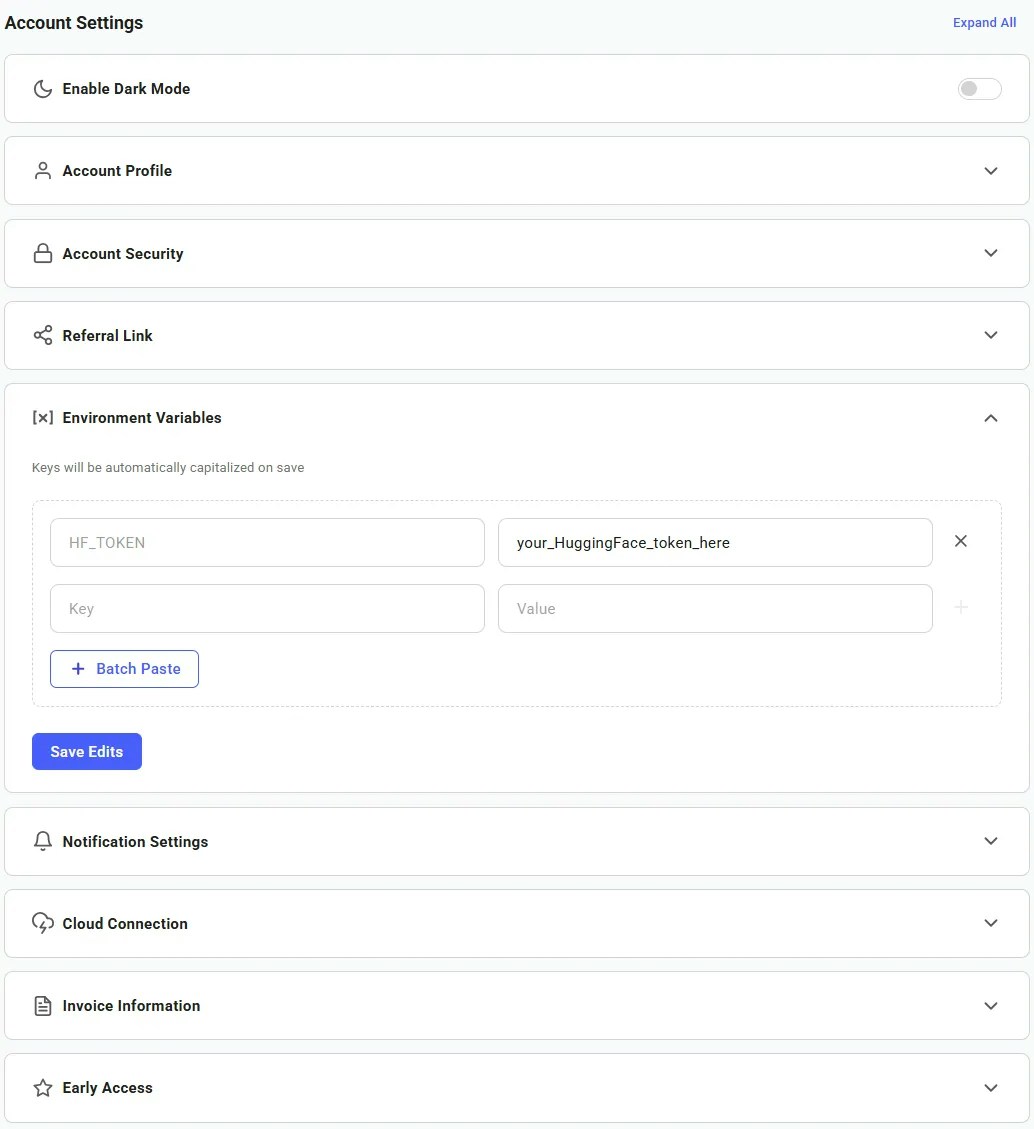 Navigate to the user account settings page here and drop down the “Environment Variables” tab. In the Key field, add “HF_TOKEN”, and in the Value field add the HuggingFace read-access token. Click the ”+” button to the right of the fields, then click “Save Edits”.